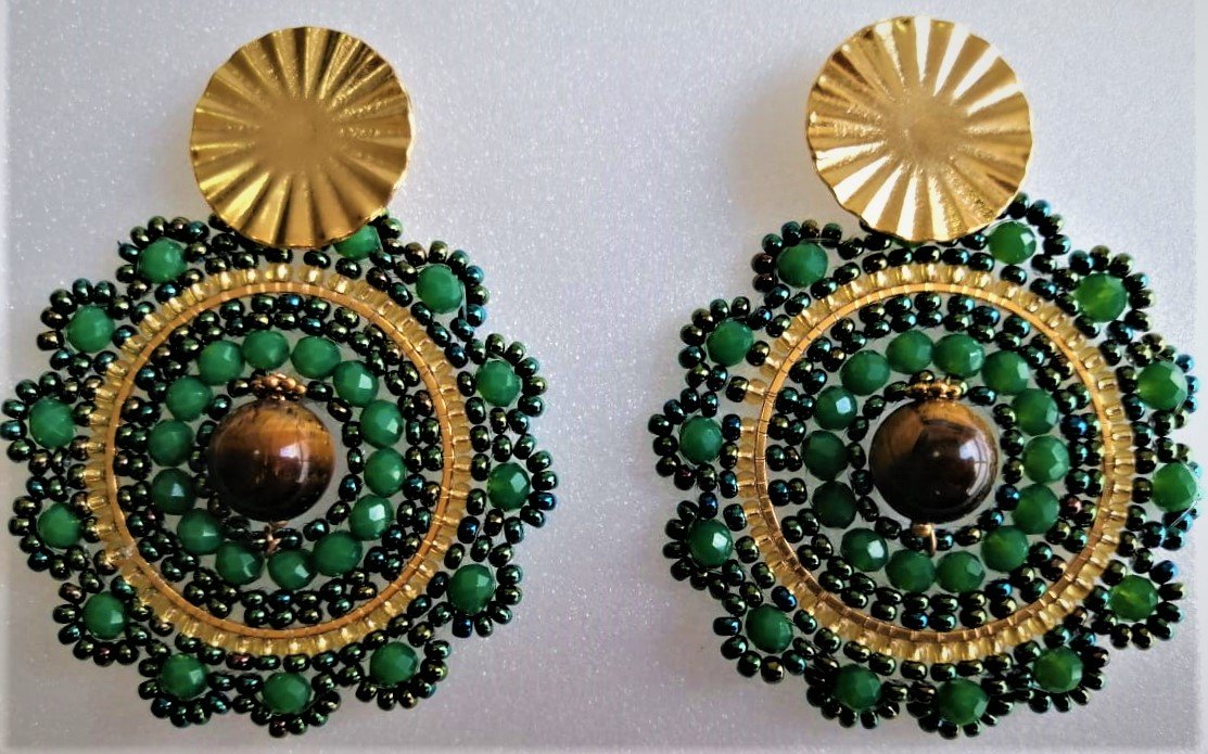 Aretes en Mandala Borde Flor Verde y Dorada con Piedra Ojo de Tigre.